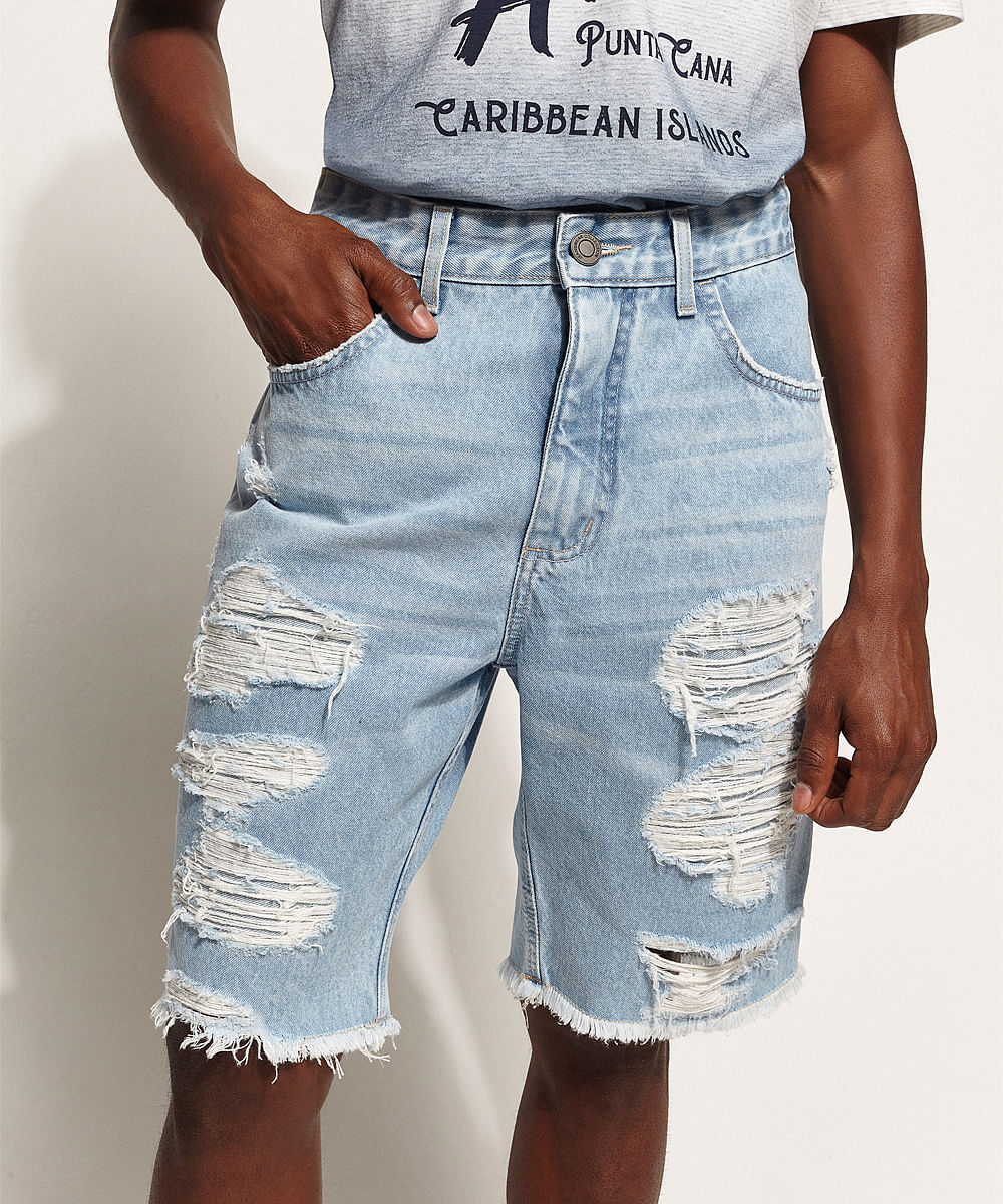 Bermuda Jeans Masculina Slim Destroyed com Bolsos Azul Claro
