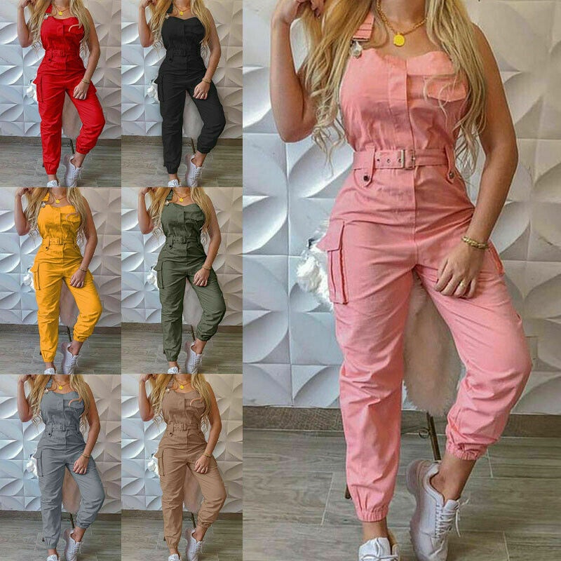 Macacão macaquinho jardineira de carga longo feminino com bolsos no cinto e alça de ombro amarrada no tornozelo