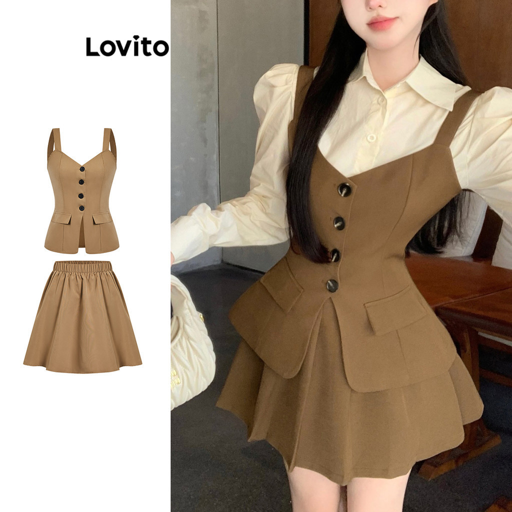 Lovito Conjunto de Saia com Botões Falsos e Bolsos para Mulheres L73AD057