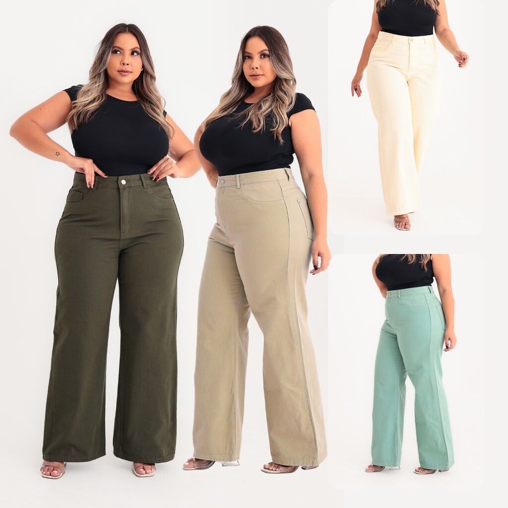 Calça Wide Leg Feminina Plus Size Sarja Cores Cintura Alta Tamanhos 48 ao 54