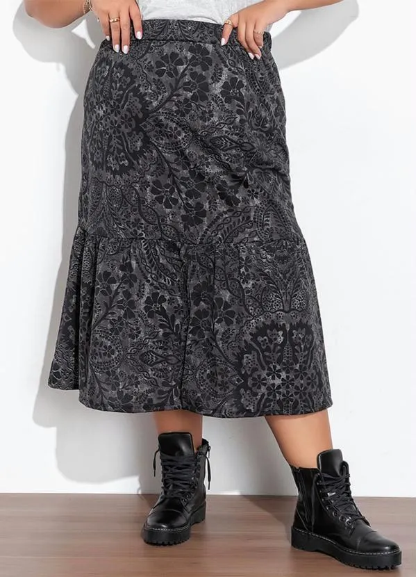 Saia Plus Size Midi Estampada Floral com Lastex e Babado Preta