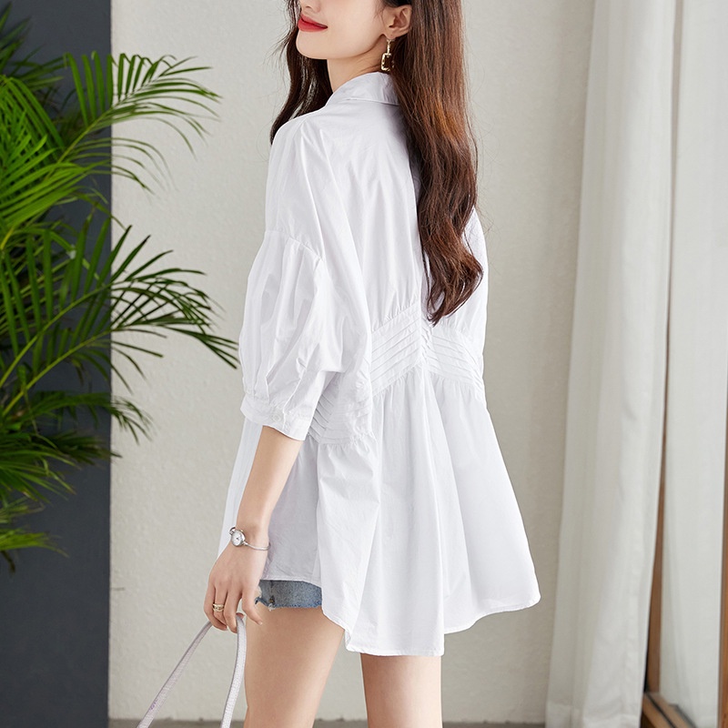 Elegante Estilo Tucker Tucker Camisa de manga branca plissada de três trimestres Camisa de algodão puro de linha A de nichos de mercado feminina