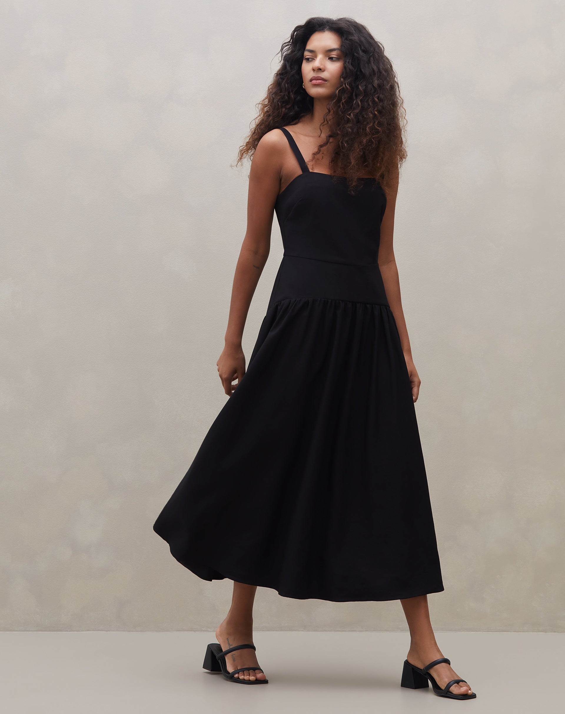 Vestido Midi de Alça com Saia Franzida - Preto