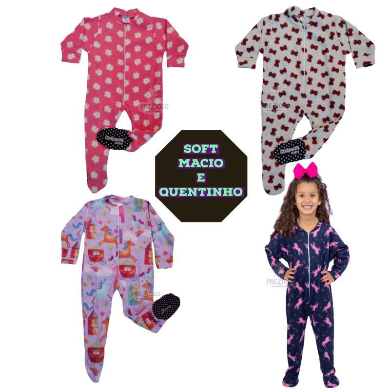 Pijama Menina Macacão Infantil Soft Com Ziper - Quentinho Com Pezinho Emborrachado até o Tamanho 8