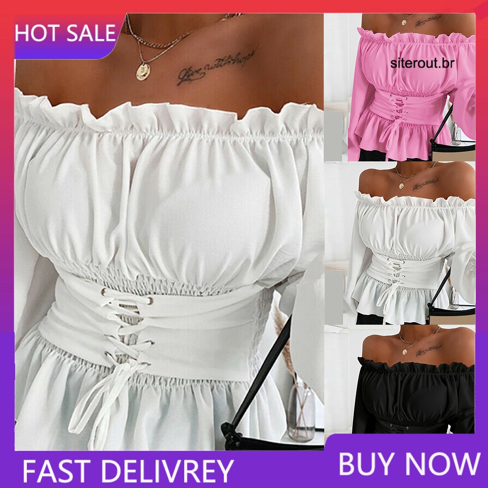 Nscs_ Blusa Feminina Casual De Cor Lisa Com Babado E Ombro Vazado E Mangas Compridas Para Outono