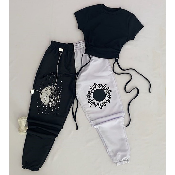 Conjunto com calça gringa sol e lua preto e branco e cropped gola alta