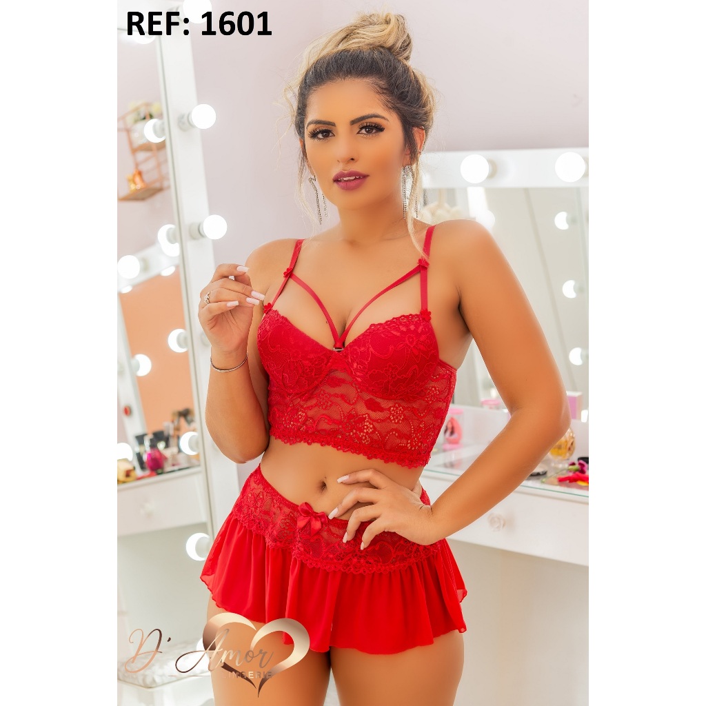 Conjunto de Lingerie em renda Sensual e tule Luxo Pecado com aro e calcinha fio duplo conforto