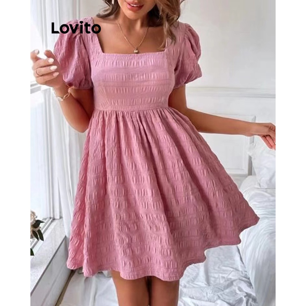 Lovito Casual Vestido Feminino Liso Esvoaçante de Manga Bufante com Babados LNE16044 (Rosa)