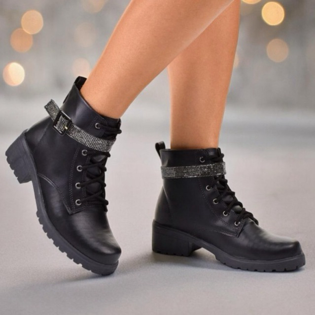 Bota Preta Feminina Botinha Coturno Salto Baixo Cano Curto Tratorada com brilho Strass