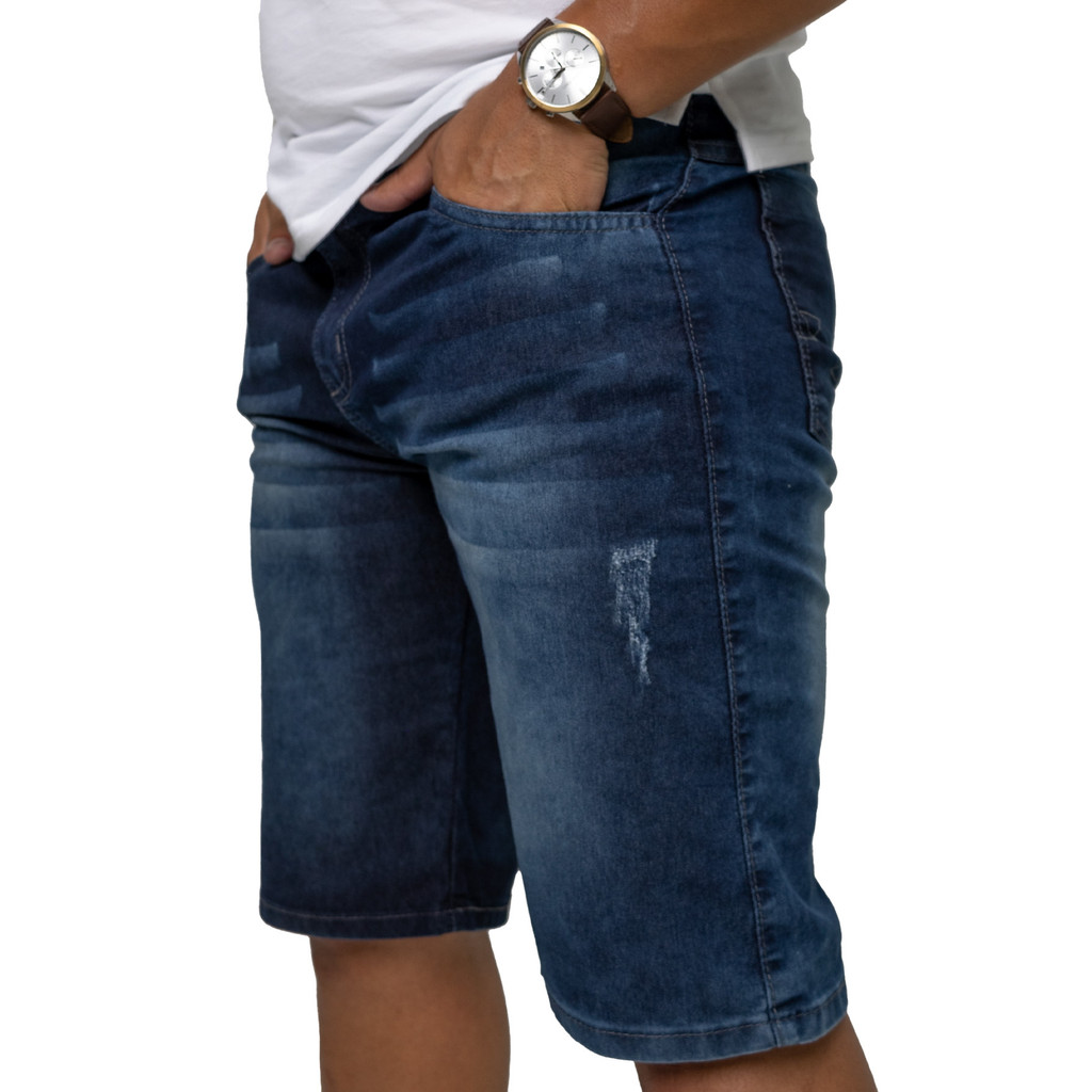 Bermuda Masculina Jeans - Elastano - Confortável - Azul médio Bigode e Puído - Short Jeans Masculino