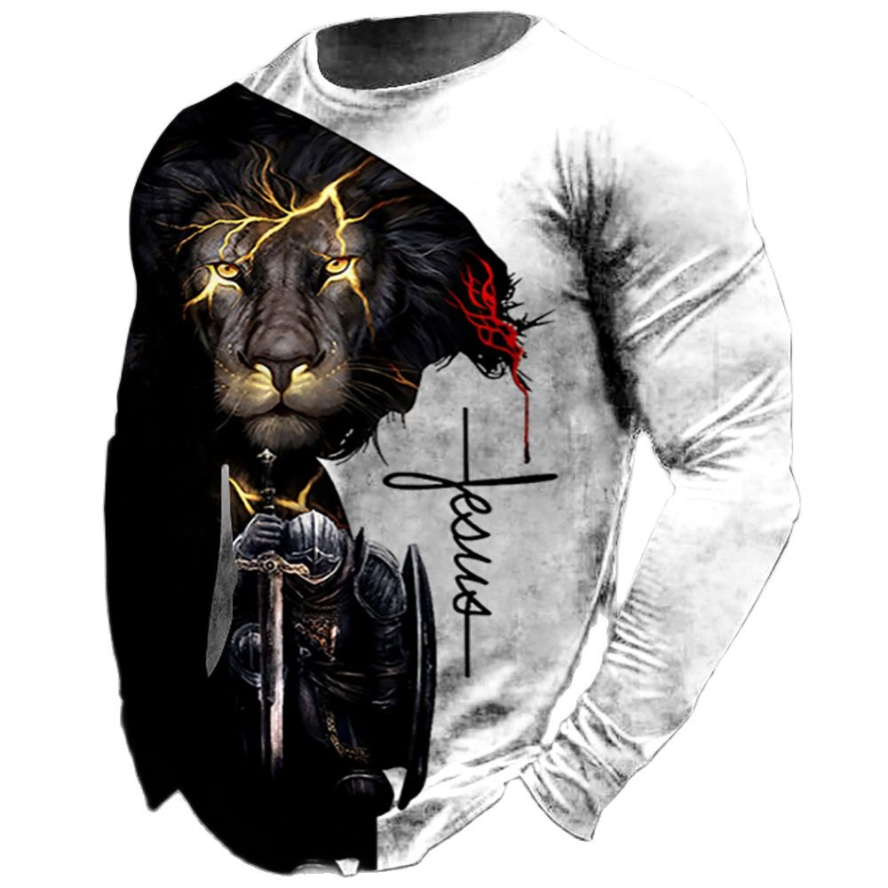 Deus Cristo Jesus e Leão T-shirt masculina estampada em 3D, manga comprida de algodão, manga comprida, camiseta de grandes dimensões 5XL respirável e confortável