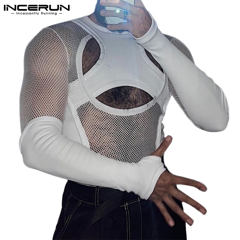 INCERUN Camiseta Masculina De Malha Manga Longa Vazada Slim Fit