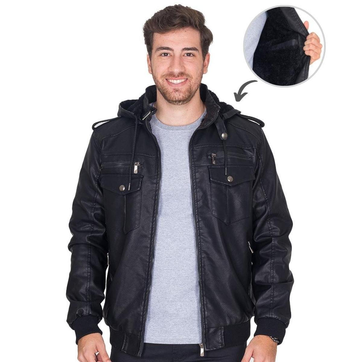 Jaqueta Courino Peluciada Masculina Capuz Removível Bolsos