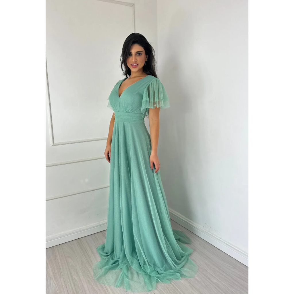 Vestido Longo de Festa Micro tule com brilho manguinha Jady Verde Menta