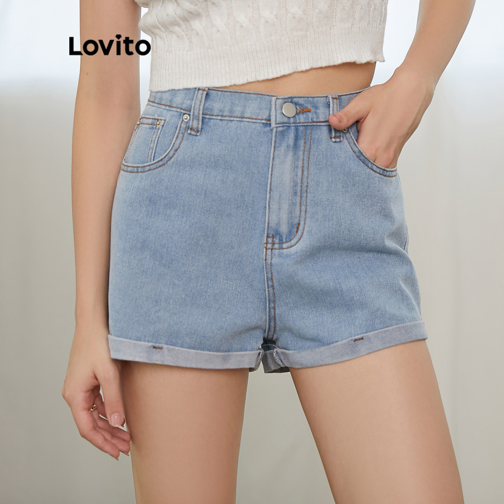 Lovito Casual Shorts Jeans Liso com Cintura elástica e Bolso Lateral Cintura Alta Bainha Dobrada L24AD023 (Azul/Branco)