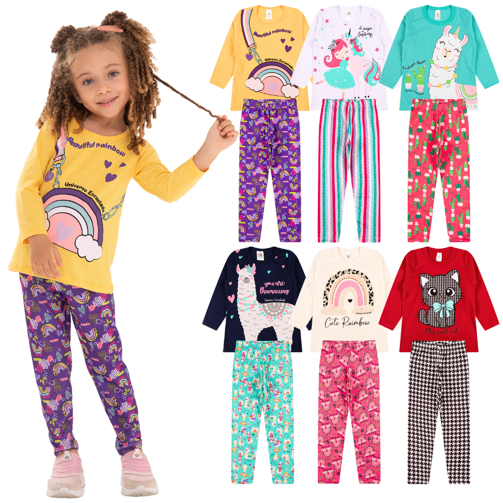 Kit Sortido 4 Peças de Roupas Feminino Infantil Inverno e meia estação – 2 camisas manga longa + 2 calças legging de 1 ao 10 – Promoção – Kit 2 Conjuntos Blusa manga longa e legging Infantil Menina