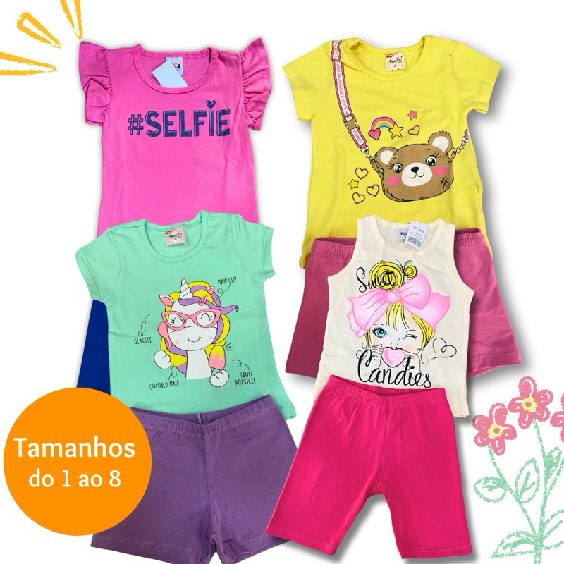 Roupa Infantil Menina Kit Verão 4 Peças 2 Conjuntos Feminino 1 ao 8 Pronta Entrega - 2 camisas 2 shorts