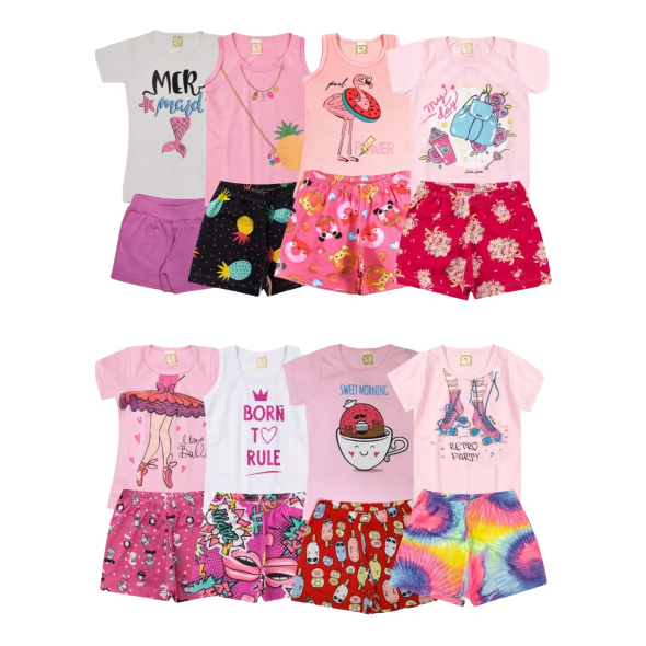 Kit 10 peças de Roupa Infantil Sortido Menina Verão Criança e Juvenil com 5 Blusa + 5 Short de Algodão/ Cotton do Tamanho 1 ao 16