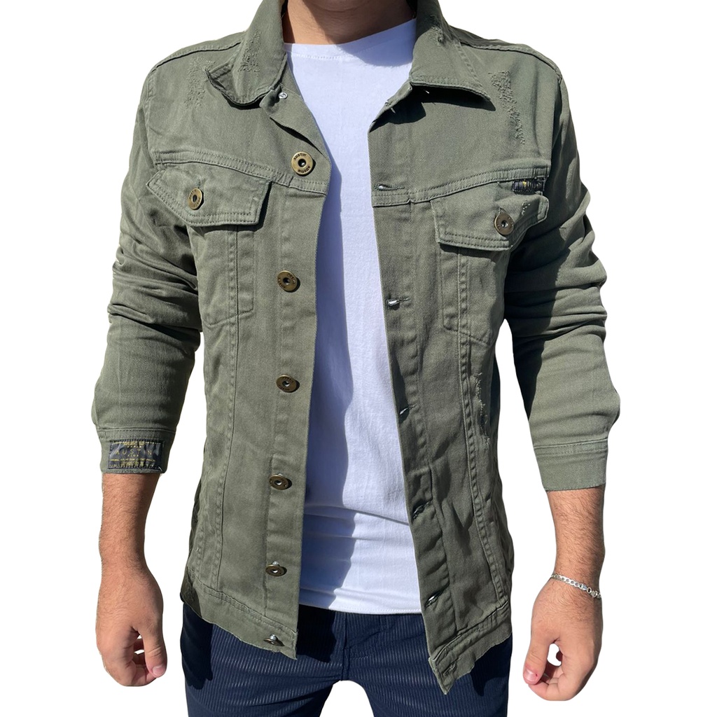 Jaqueta Destroyed Sarja Jeans Verde Musgo Slim Masculina