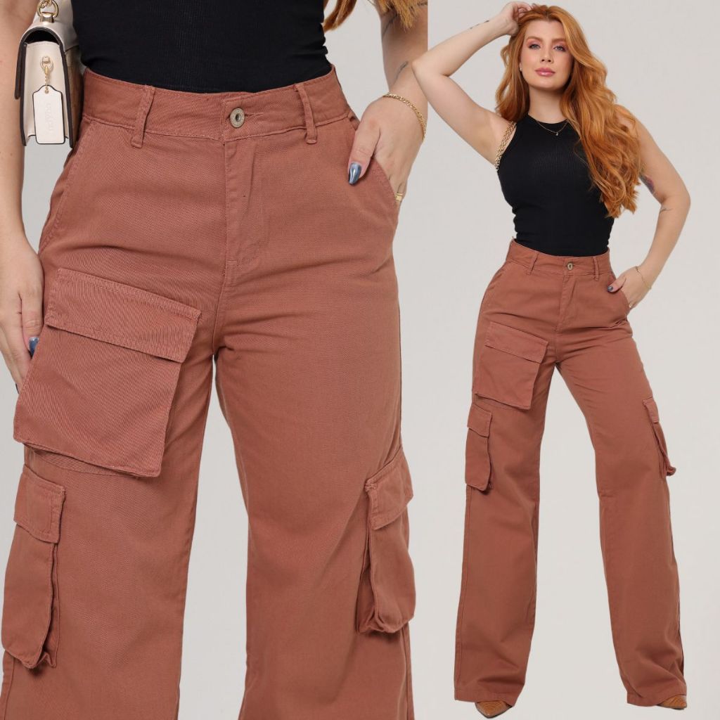 Calça Cargo Feminina Jeans 100% Algodão com Bolsos Cintura Alta Empina Bumbum Wide Leg Marrom Tendência Mocha Mousse