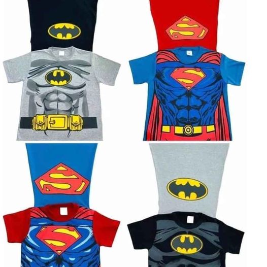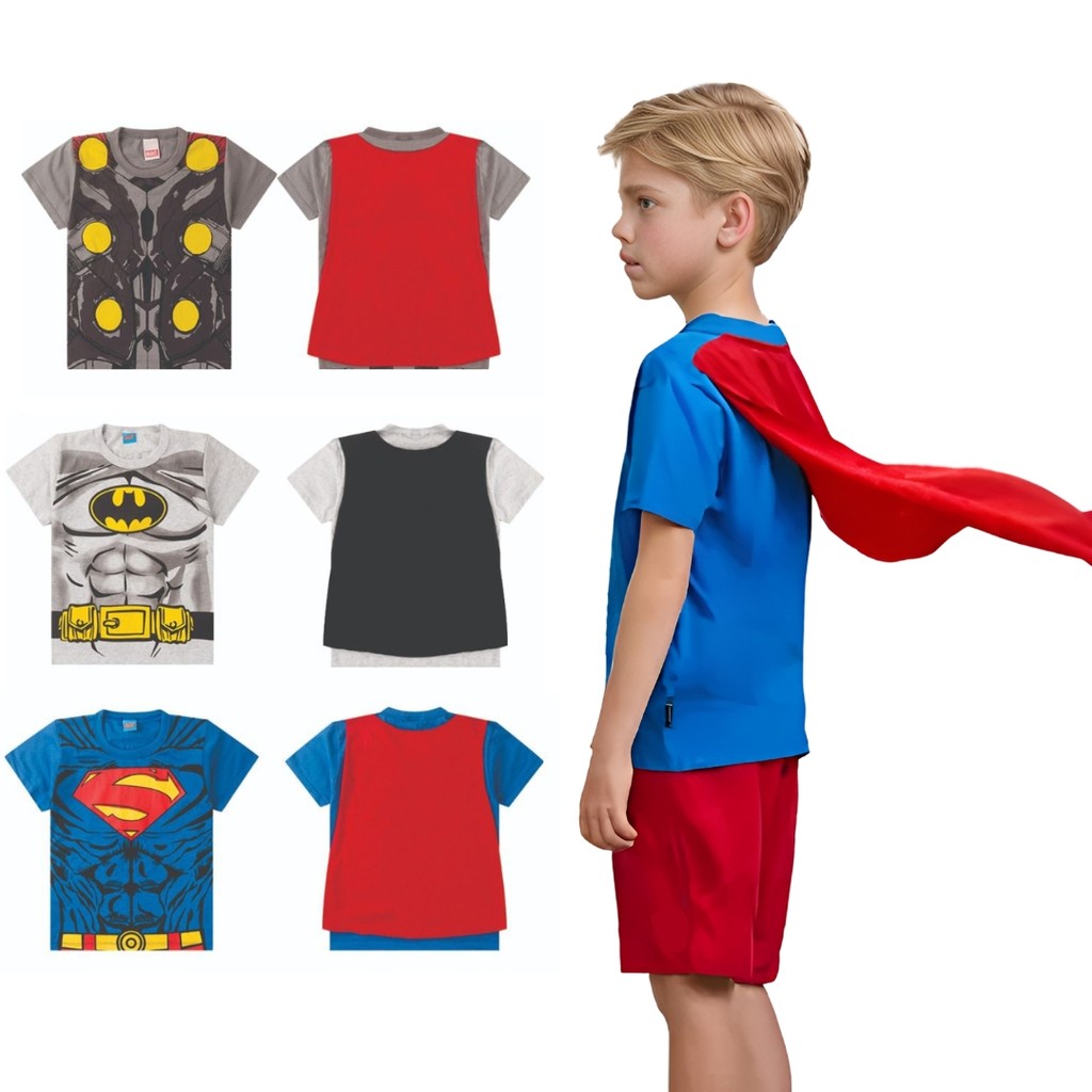 Camiseta Menino Manga Curta Infantil Com Capa Batman Super Homem Homem Aranha.