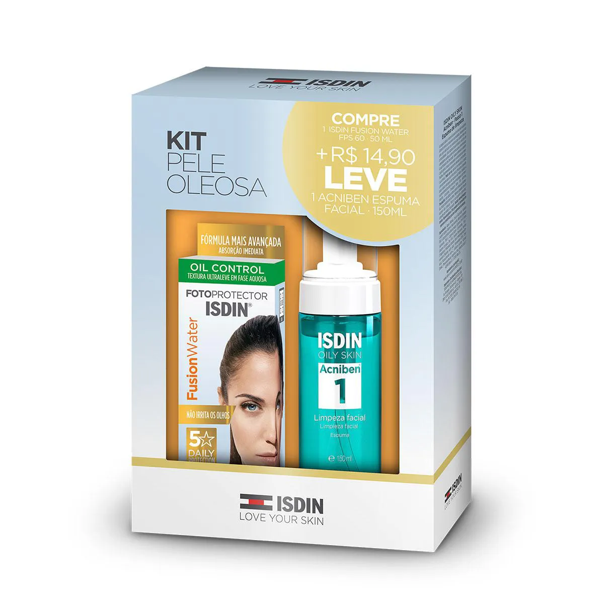 Kit Facial Isdin Protetor Solar Fusion Water FPS 60 50ml + Espuma de Limpeza Oily Skin Acniben 1 150ml