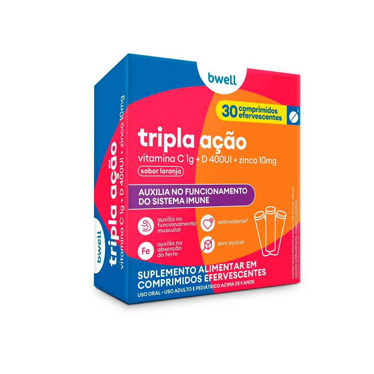 Vitamina C Efervescente 1g bwell Tripla Ação Sabor Laranja 30 comprimidos