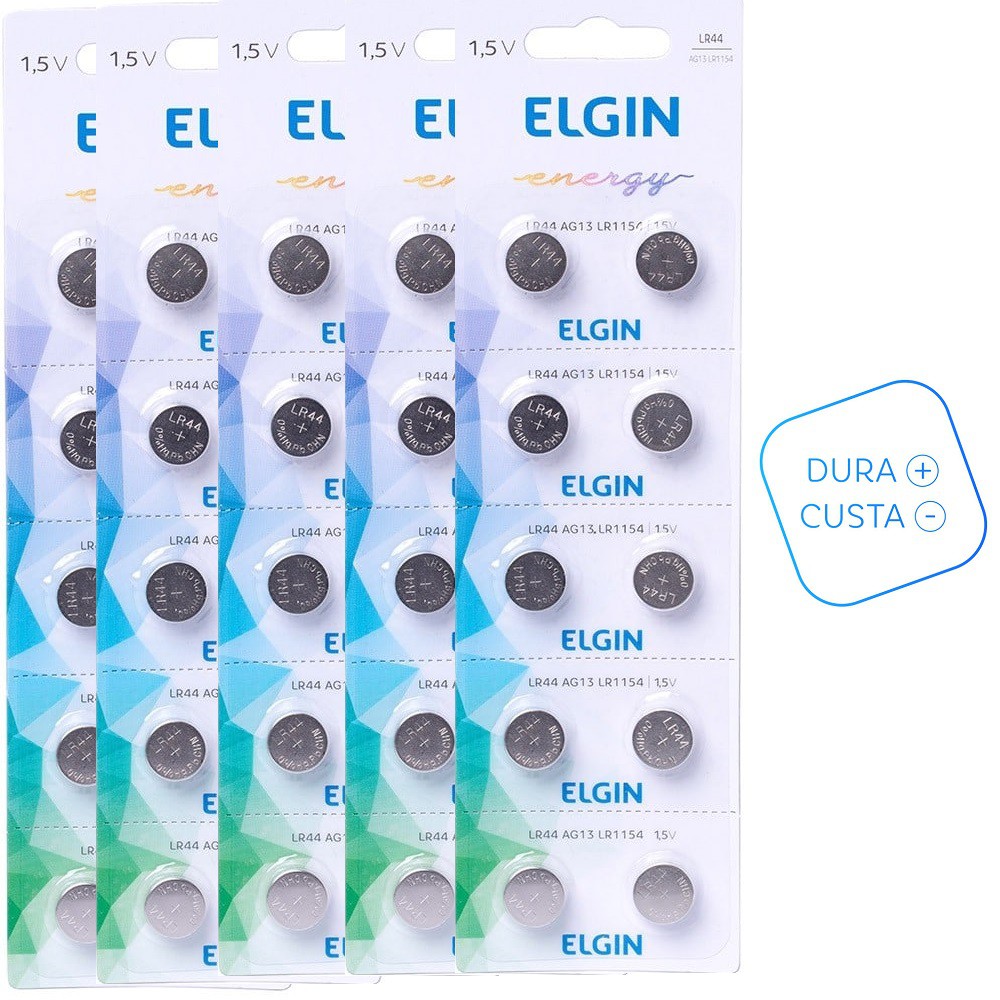 50 Pilhas Baterias Alcalina Elgin LR44 AG13 LR1154 5 Blister/Cartela com 10 Unidades Cada Original