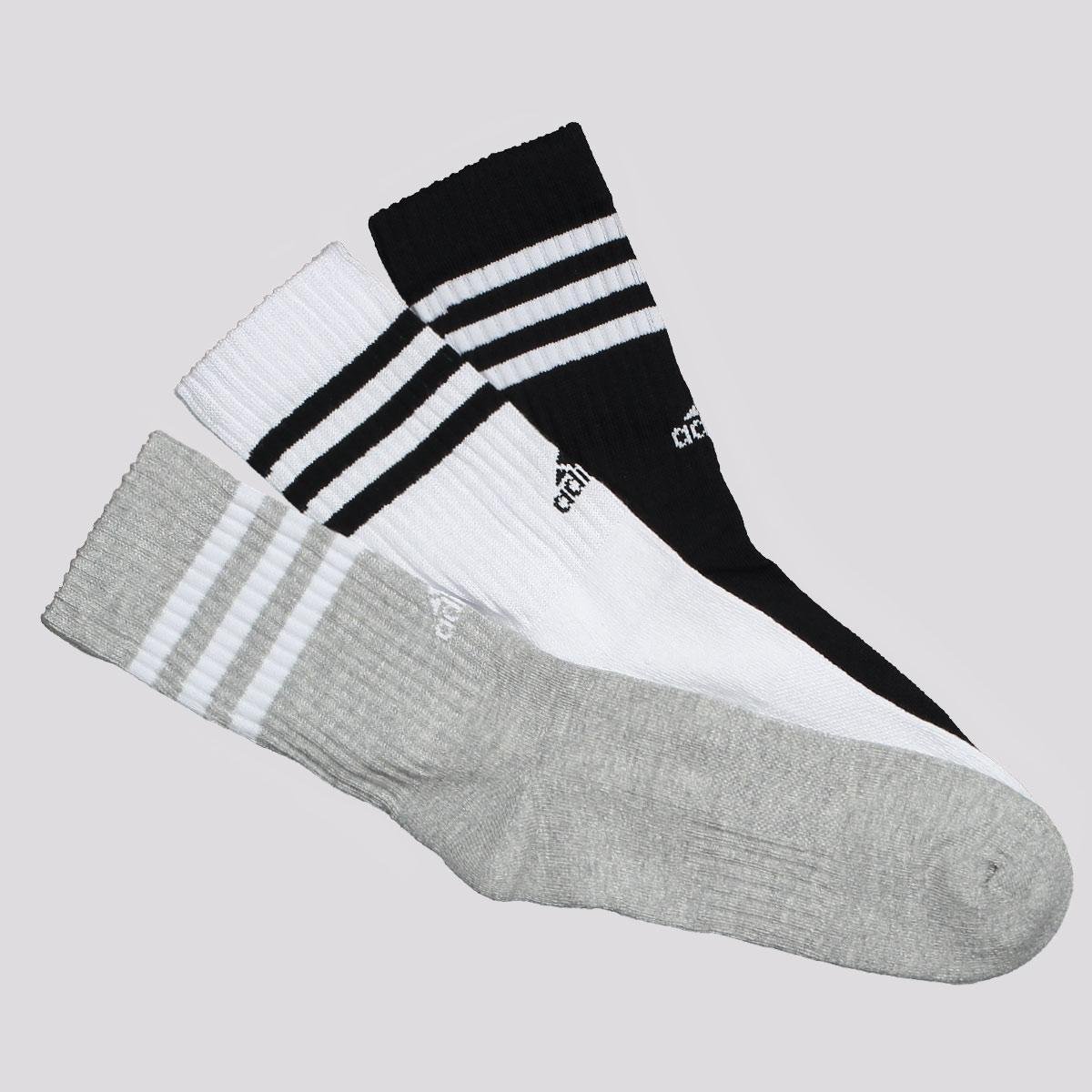 Kit Meia Adidas 3S 3 Pares Cano Alto Cinza Branca e Preta
