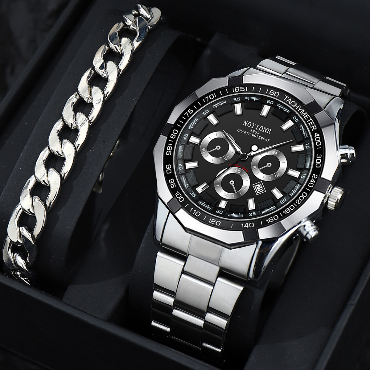 2PCS Fashion Men Relógio Redondo De Aço Inoxidável Conjunto De Pulseiras De Calendário Casual Masculino