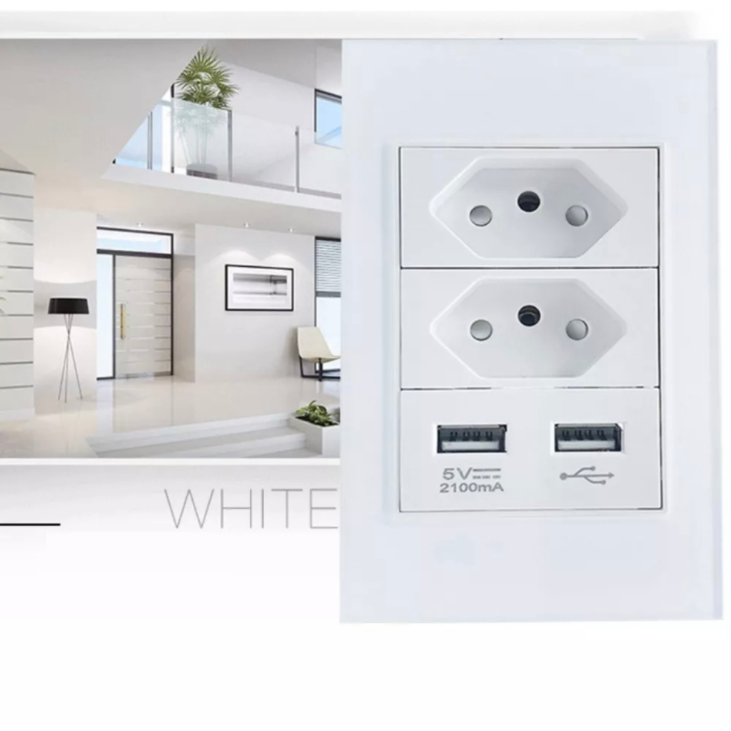 Tomada para Parede Universal com Entrada USB Com 2 Tomada Energia 10A e Módulo Carregador USB de Celular