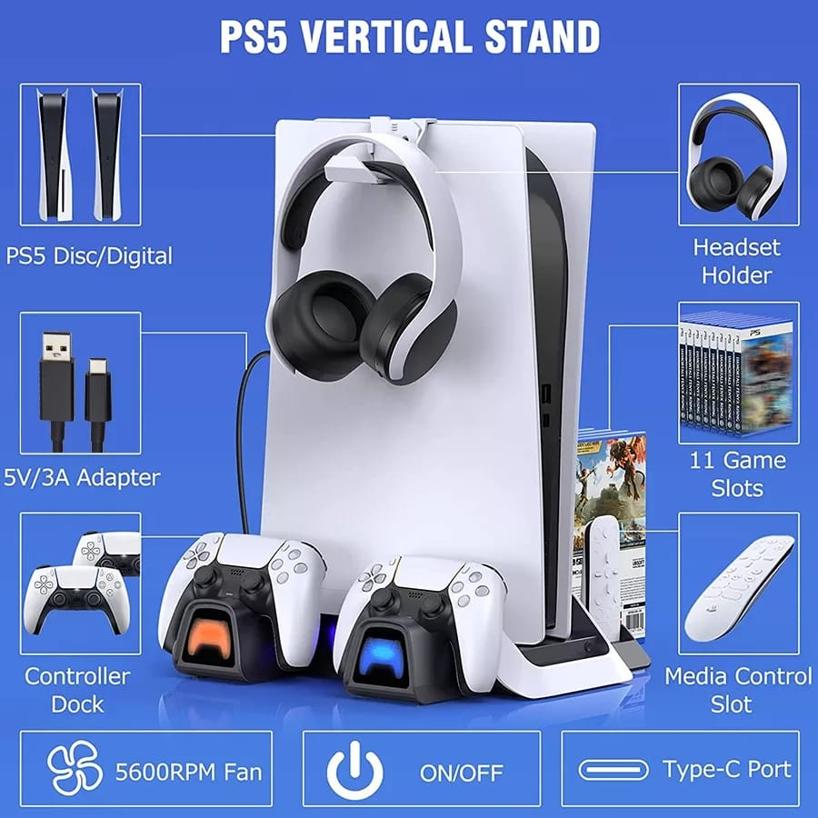 Suporte PS5 com Carregamento Dualsense Cooler de Resfriamento Porta 11 Jogos e Controle de Mídia