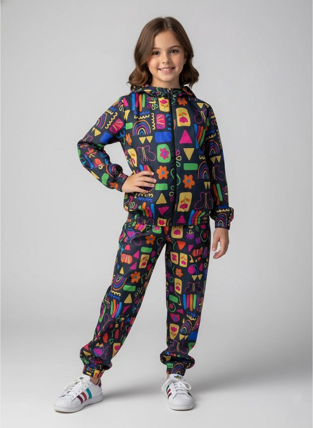 Conjunto Infantil Menina Corta Vento C/Capuz Pop Retrô Preto 0565 - Laluna