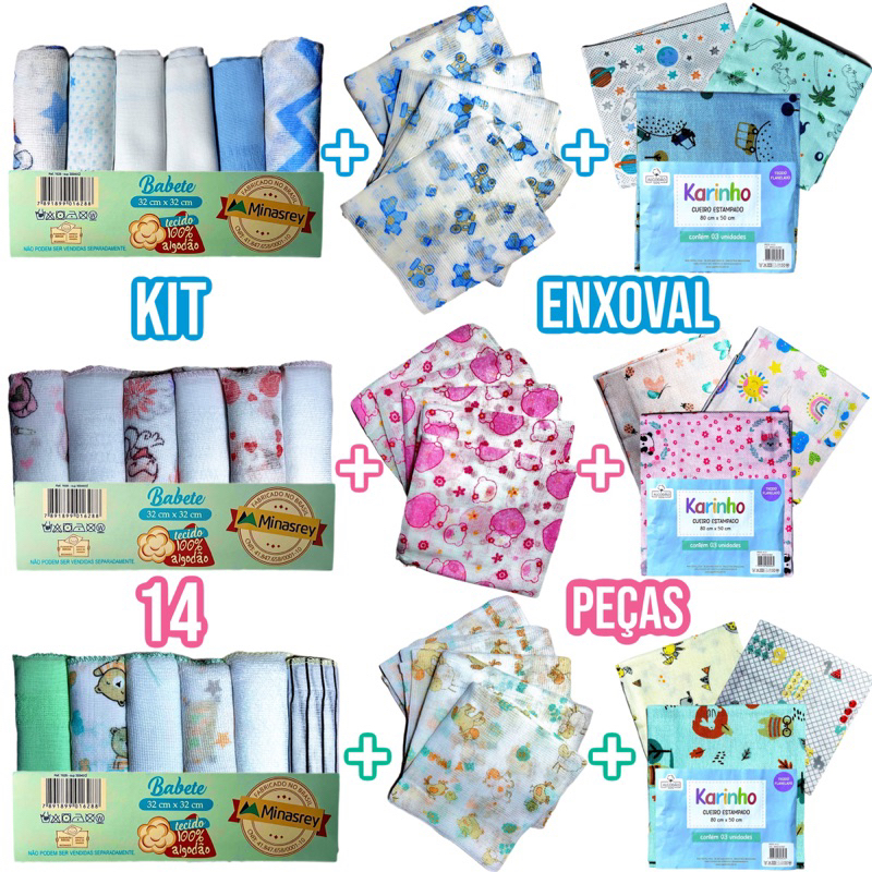 Kit Bebe Infantil 14 Peças 6 Paninho de Boca 5 Fralda de Pano 3 Cueiro Flanelado 100% Algodão Enxoval de Bebê