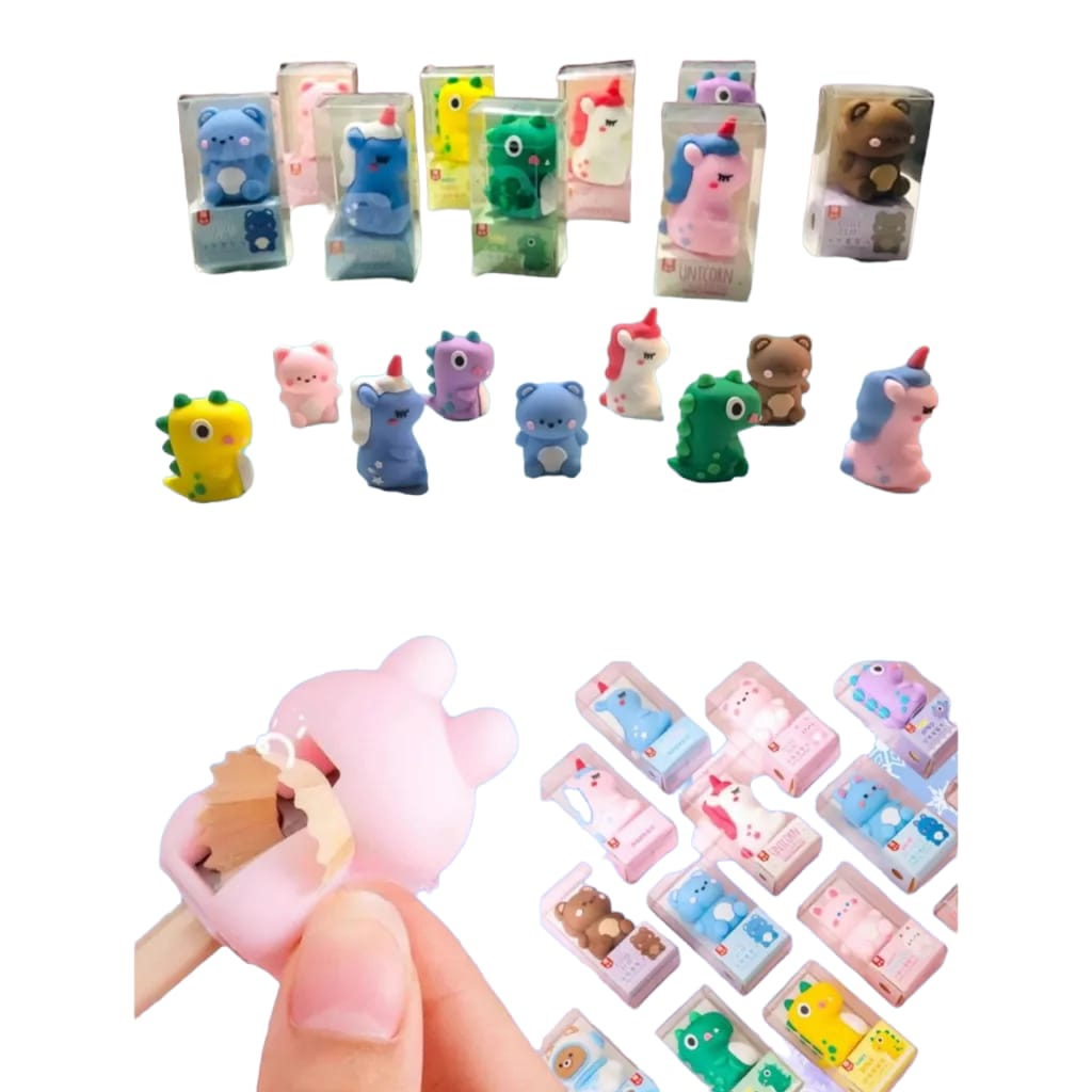 KIT 4 Conjunto Apontador De Lápis Com Apagador Dinossauro/ Unicornio/ Urso Simples e Urso com Touca Papelaria/Escritório/Escola