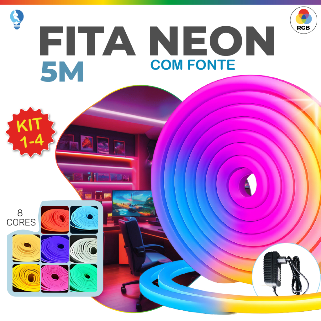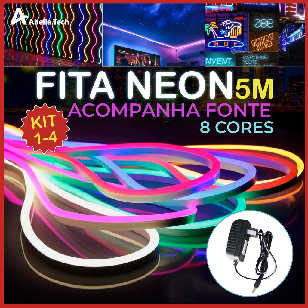 Kit 4 Fita de LED Mangueira Neon 5 Metros 60W Flexível Com Fonte 12V | 8 Cores