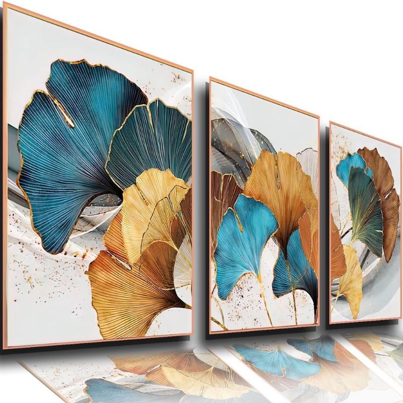 Kit 3 Peças Quadros Decorativos Mdf Flores Ton Gold Folhas Moldura Para Quarto Sala Escritório Moderno