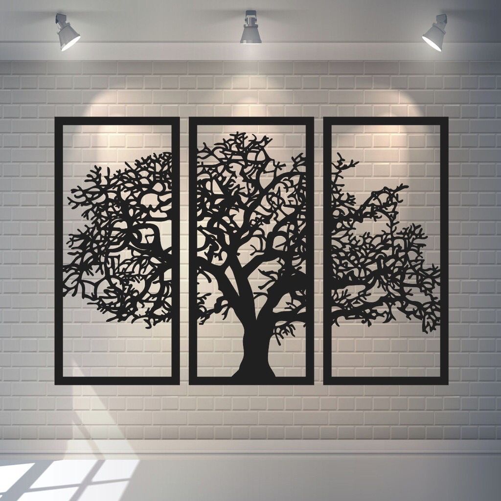 Quadro Vazado Árvore Da Vida 3 Peças Decoração Sala Quarto Cozinha Mdf 3mm Preto