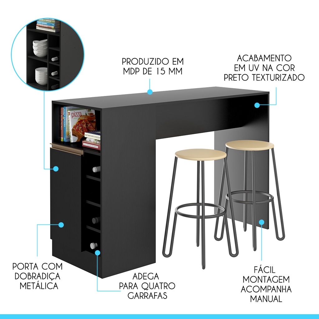 Bancada Ilha de Cozinha Americana 136 x 92 Cm 1 Porta Nicho Adega MDP Preto Texturizado 0535 MENU