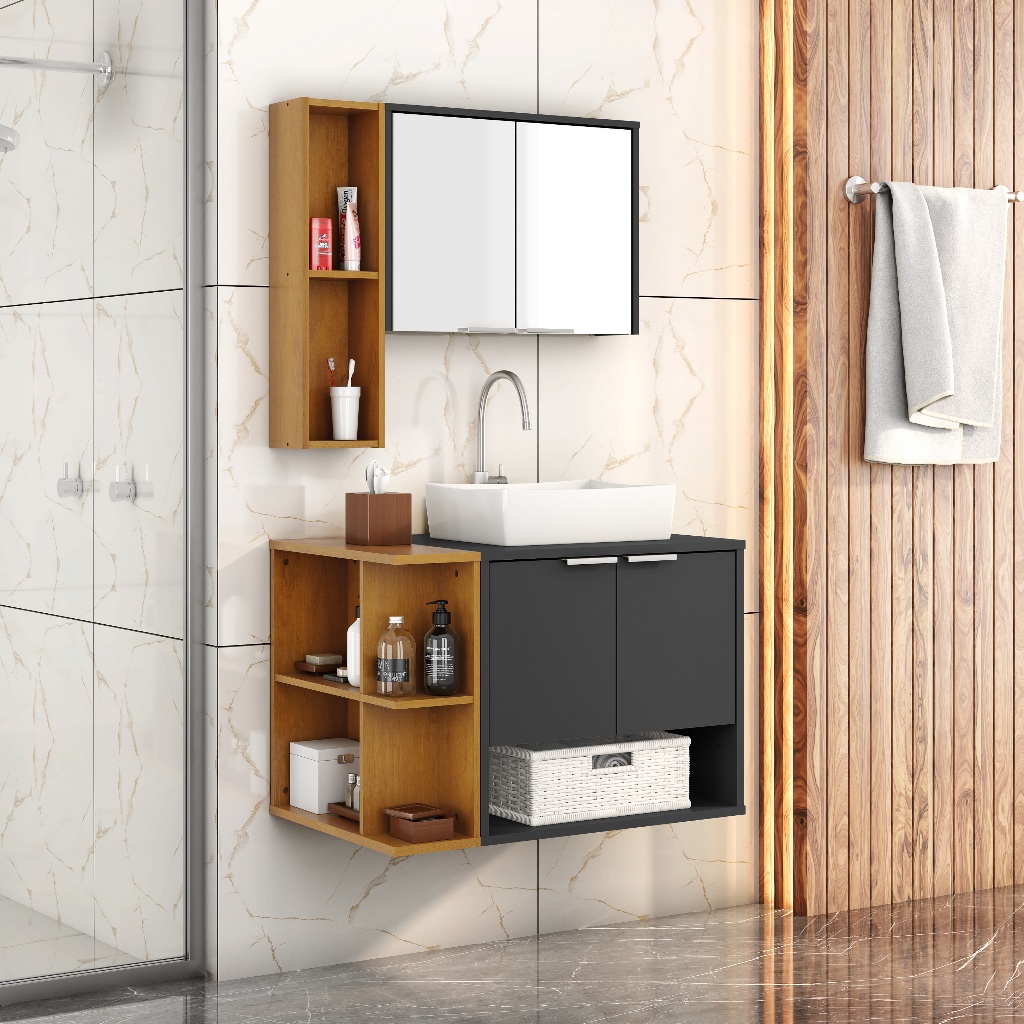 Kit Banheiro Gabinete 80 Cm com Cuba e Armário com Espelho Cor:grafite com Preto