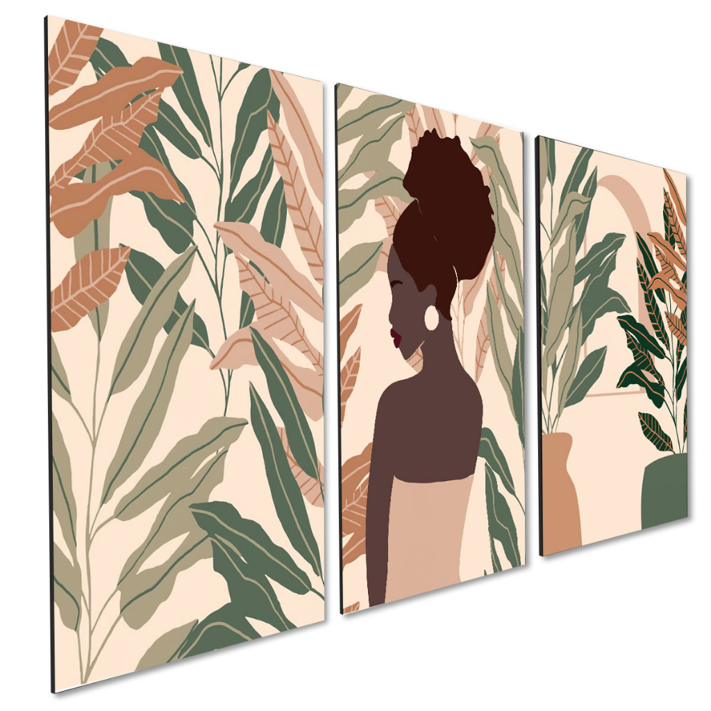 Kit 3 Quadros Decorativos Abstrato Estilo Boho Mulher Negra Folhas Casa Sala Quarto