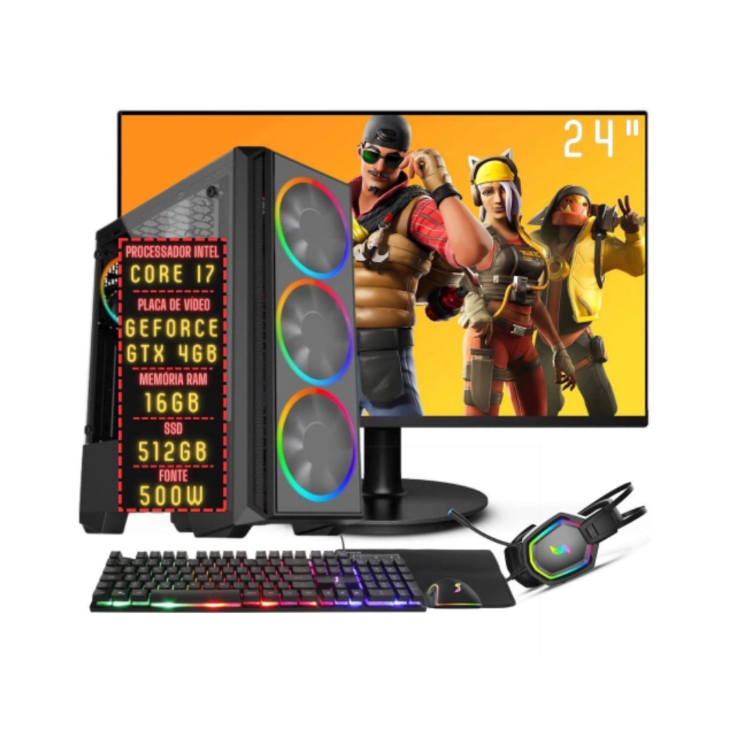 Pc Gamer Completo 3 green fps Intel Core i7 16 Gb ram Placa de Vídeo Geforce gtx 4Gb ssd 512Gb Monitor 24’’ Full HD 75 Hz Fonte 500W 3 GF-064