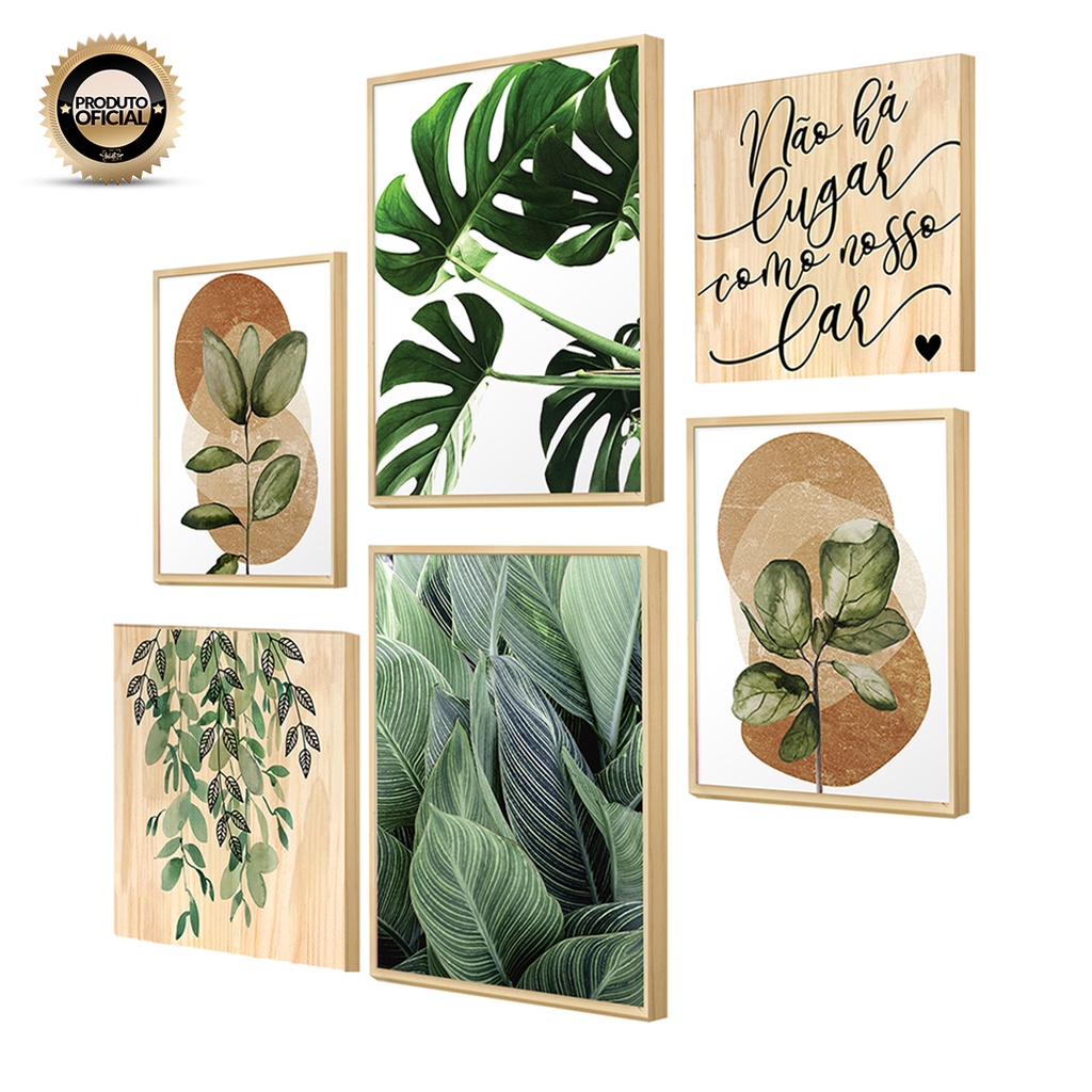 Kit 6 Quadros Modernos Decorativos para Quarto Casal 88x84cm Folhas Verdes e Moldura Caixa -Hugart