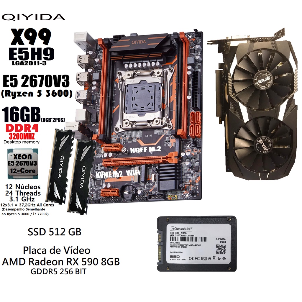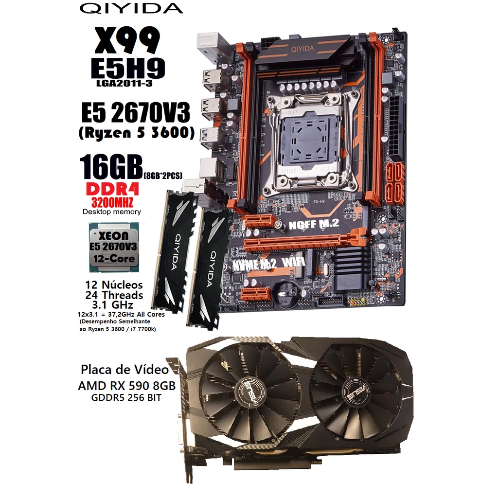 Kit X99 Gaming Xeon E5 2670v3 12 Núcleos (Ryzen 5 3600) + 16GB DDR4 + RX 590 8GB + Cooler 2 Fans LED