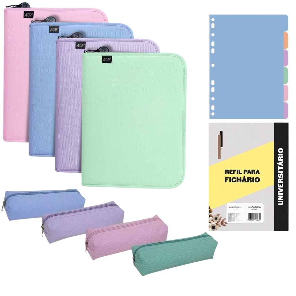 Fichário Colegial Com Estojo Caderno Argolado com 6 Divisórias Coloridas Bloco 96 Folhas Sweet Com Zíper Grande Escola Faculdade Trabalho Escola Rosa Verde Azul