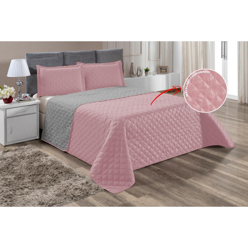 Kit Cobre Leito Dupla Face Cama Casal Queen Colcha 03 Peças Matelado Duas Cores