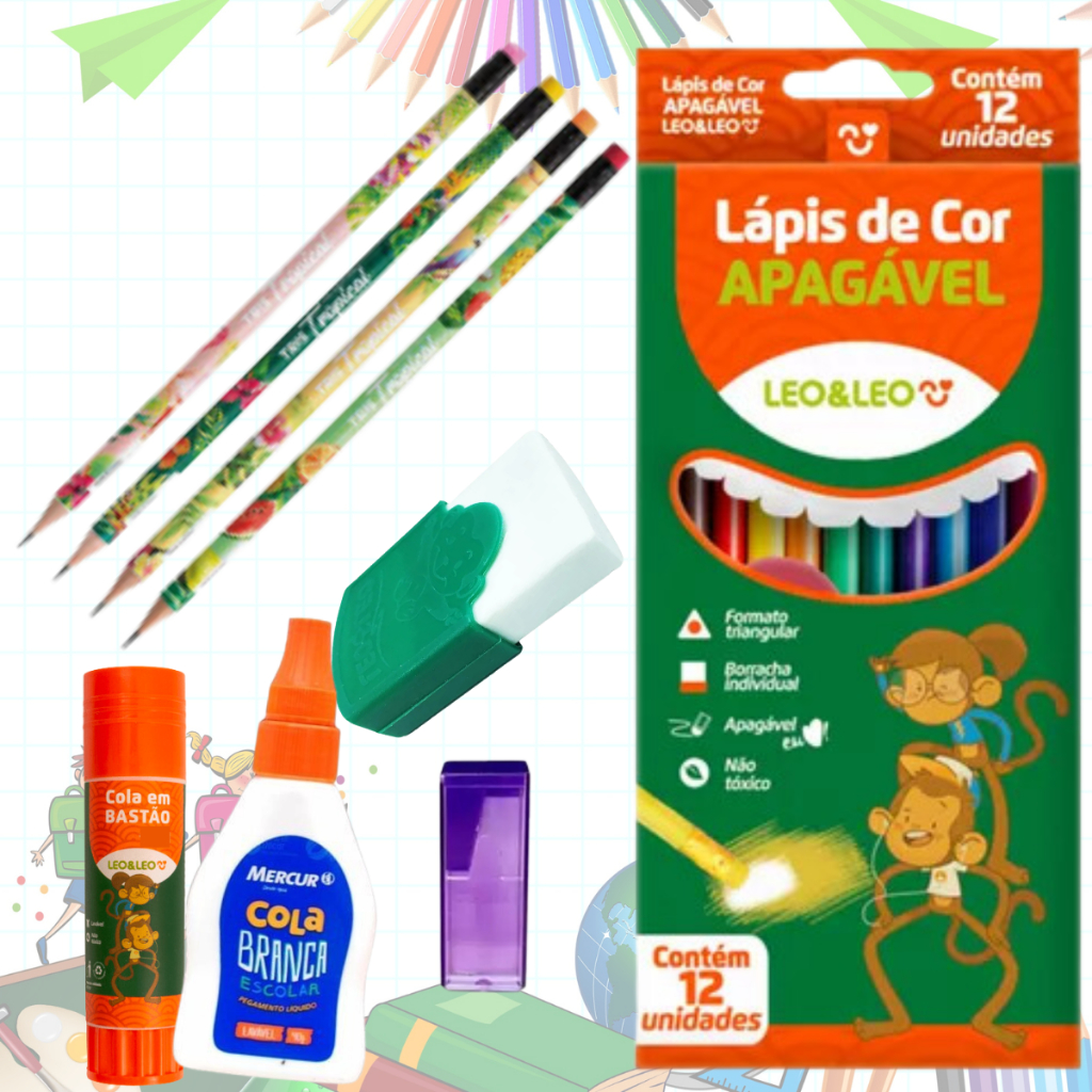 Kit Escolar Infantil Material Escolar Papelaria Barato 19 Itens Lápis de Cor Lápis de Escrever Cola Borracha Apontador Cod.LT19