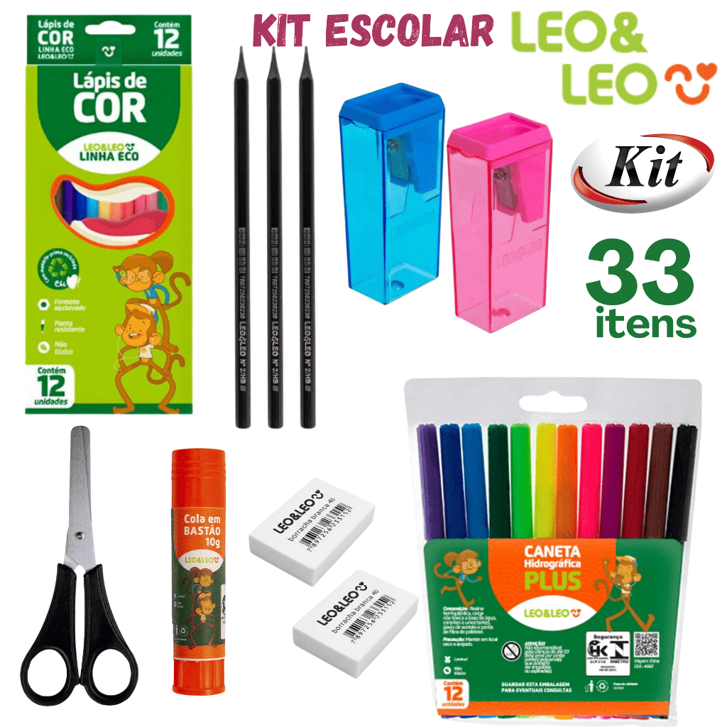 Kit Escolar Infantil Leo Leo Kit Com 33 Itens Para Colorir e Escrever - Lapis De Cor + Canetinha + Apontador + Borracha + Tesoura + Cola Bastão + Lapis