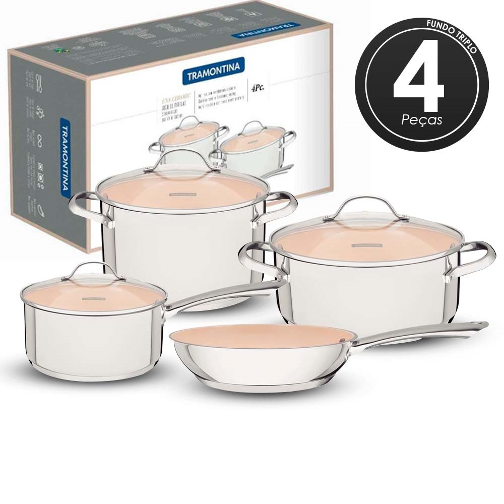 Jogo de Panelas Tramontina Una Ceramic Aço Inox Fundo Triplo Revestimento Interno Cerâmico 4 Peças