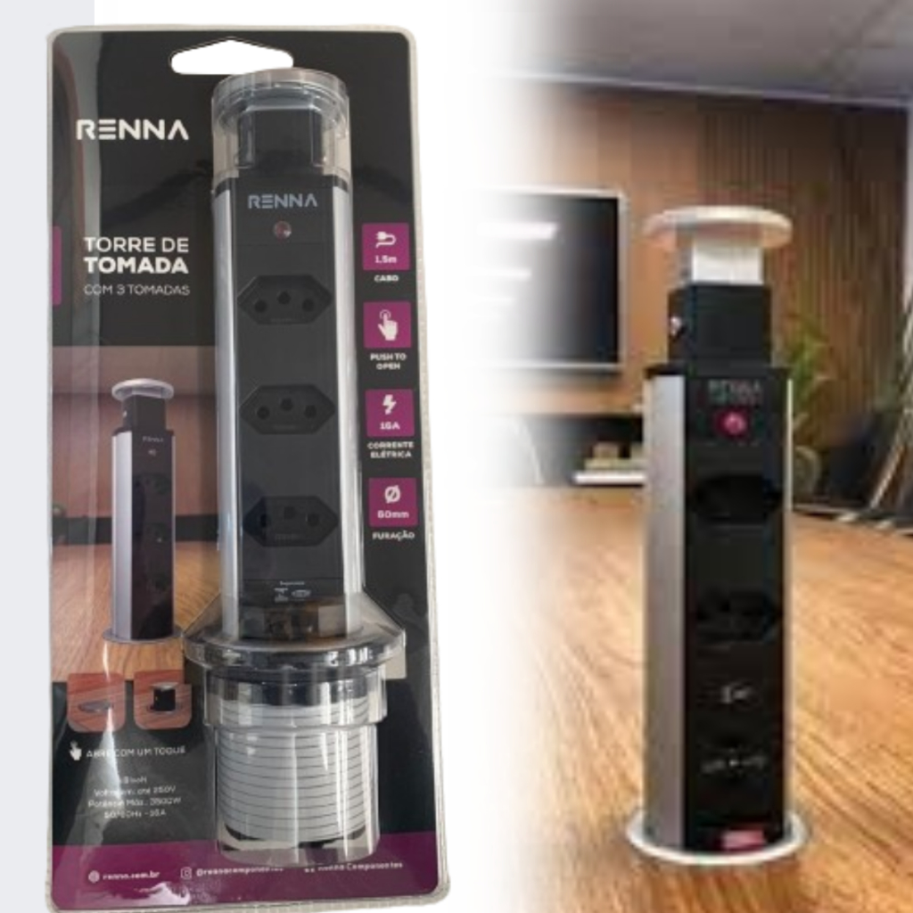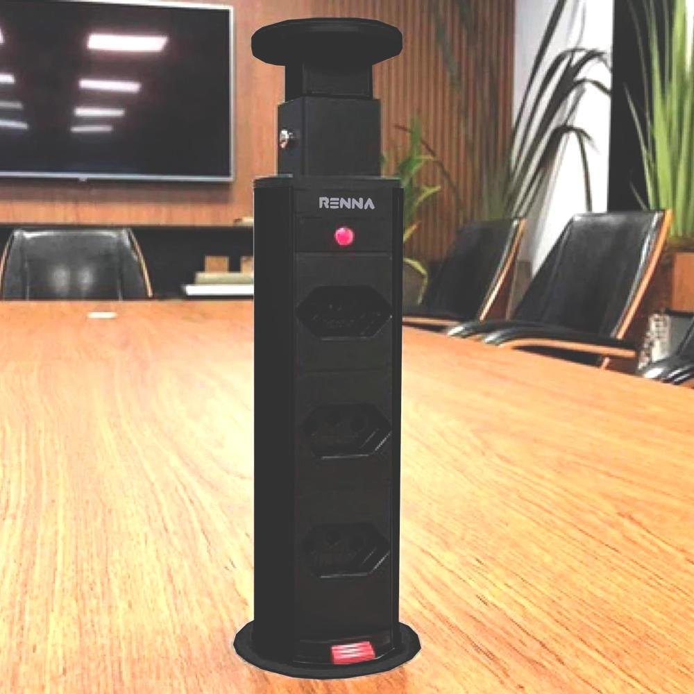 Torre De Tomada CINZA Com 3 Entradas para tomadas 10a/20a Retratil Embutir Mesa Marca- RENNA ORIGINAL